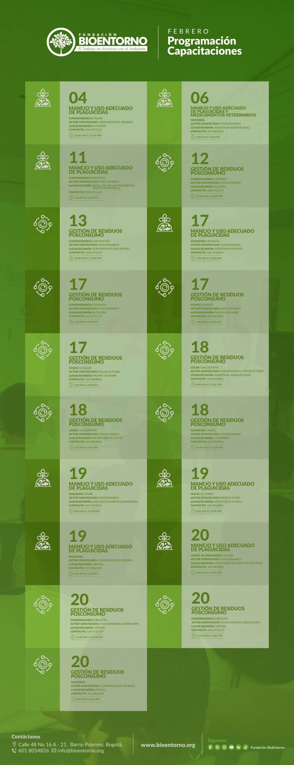 La Fundación Bioentorno, como Entidad Sin Ánimo de Lucro, está comprometida con la preservación de la salud humana y la protección del medio ambiente. Su labor se enfoca en diseñar e implementar soluciones innovadoras para la gestión socioambiental de los sectores productivos en Colombia.